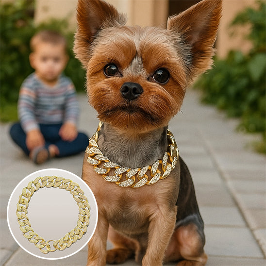 Transformez votre promenade quotidienne en véritable défilé de mode. Notre collier pour chien en chaîne cubaine est bien plus qu'un simple accessoire fonctionnel – c'est une véritable pièce de joaillerie canine. Disponible en finitions or ou argent rehaussées de pierres incrustées, il apporte une touche de sophistication immédiate à n'importe quelle race. Qui a dit que style et sécurité ne pouvaient pas coexister?